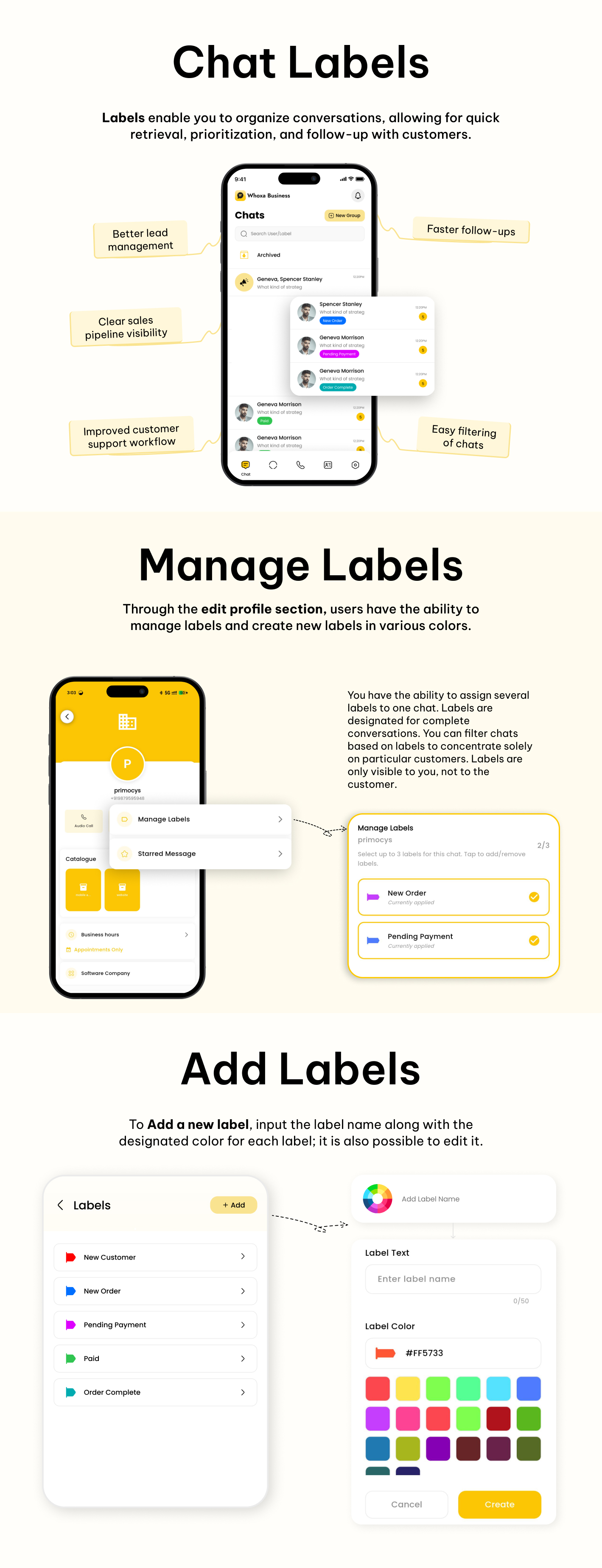 Chats can be labeled as New Lead, Customer, Follow-Up, Paid, or Support, helping businesses organize conversations efficiently.