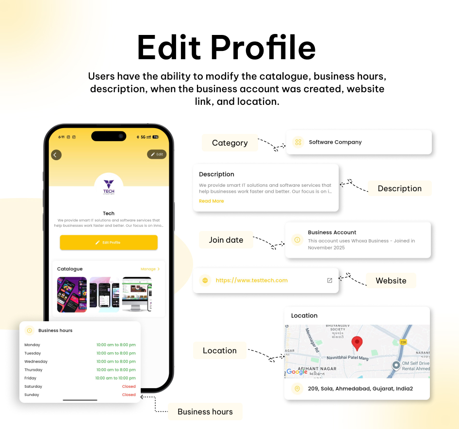 Dedicated WhatsApp Business–style accounts with business profile details such as business name, category, description, and contact information.