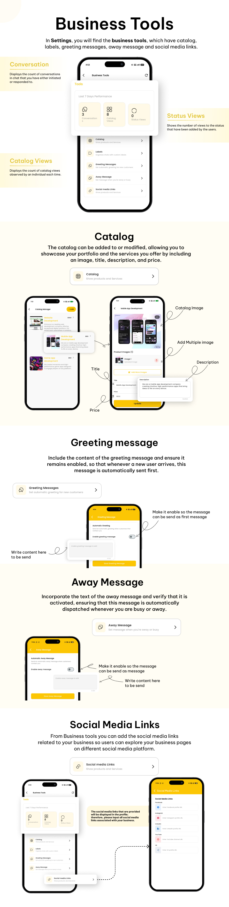 Businesses can create and manage product or service catalogs with images, prices, and descriptions. Catalogs can be shared directly in chats, and businesses can track catalog views.
