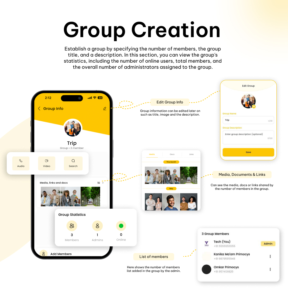 Group admins can add or remove participants and manage group settings just like the WhatsApp app.